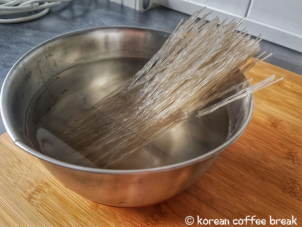 Premièrement, on trouve une poêle assez grande pour accueillir notre viande (tâcher de séparer les tranches). Une fois la viande bien éparpillée dans la poêle, on ajoute la garniture de bulgogi puis on mélange doucement afin de ne pas déchiqueter la viande. Un peu de douceur dans ce monde de brutes. Puis on met le tout dans le frigo pour une durée de 30 minutes. Parallèlement, je m’occupe de baigner les pâtes dans de l’eau afin de les ramollir pendant une vingtaine de minutes. On les rince par la même occasion.