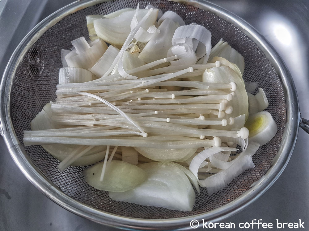 Pendant que nos pâtes se baignent et que notre viande se repose, je commence à découper mes légumes. Vous faites comme vous voulez, en fonction de vos préférences en matière de coupe. Pour les champignons enoki, découper bien la base pour ne laisser que les jolies tiges.