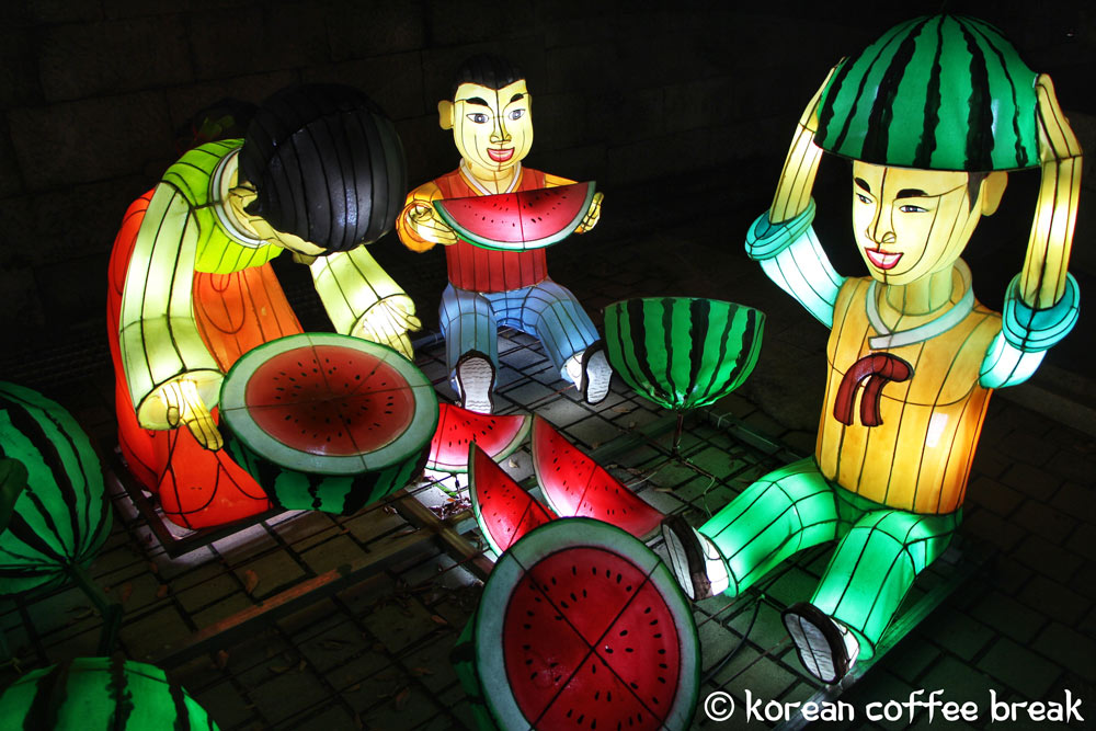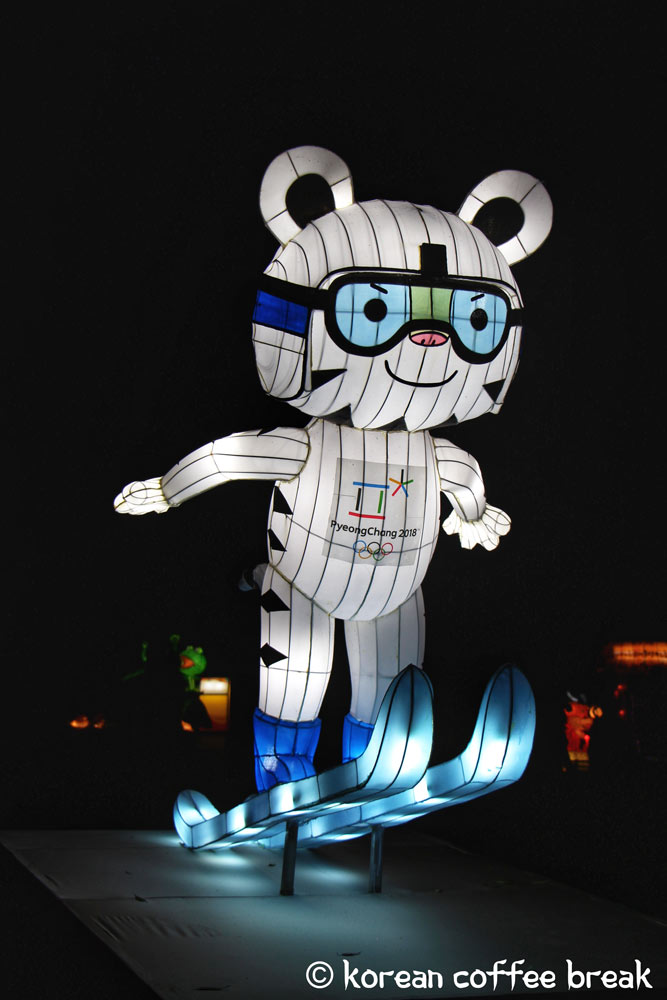 Après avoir traversé le fleuve pour la seconde fois, nous sommes arrivées dans un espace dédié à l’enfance avec des lanternes sur le thème des dessins animés Disney tels que Cendrillon, Blanche-Neige ou encore la Belle et la Bête. Larva, dessin animé bien connu des Coréens, était évidemment de la partie ! Notre visite se poursuit le long du fleuve où on rencontre de nombreuses lanternes d’insectes (heureusement pas d’araignée au programme ^^) et d’animaux sans oublier un coin pour les amoureux 😉 .