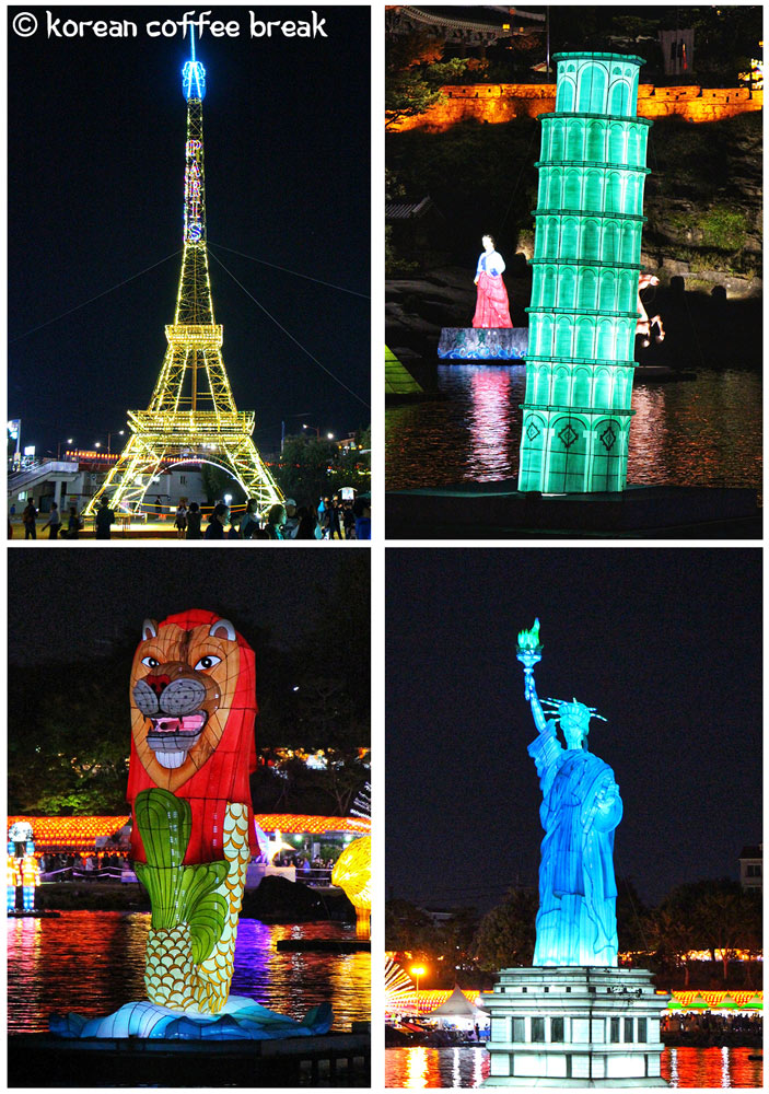 Revenant sur nos pas, nous avons suivi la foule en direction du fleuve. Nous avons traversé celui-ci sur un passage de grosses bouées flottantes sur l’eau pour rejoindre l’autre rive. C’est alors l’occasion d’admirer les nombreuses lanternes flottantes coréennes et l’exposition des lanternes traditionnelles représentant des monuments célèbres dans le monde entier. Aussi, nous avons marché sous le tunnel des lanternes à vœux. Il était d’ailleurs possible d’acheter ou de fabriquer la sienne.