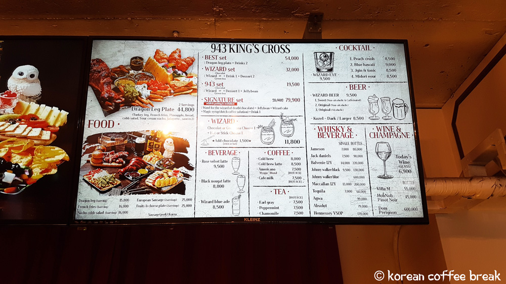 Ainsi, au Harry Potter Cafe, dans les boissons classiques vous pourrez faire votre choix parmi le « rose velvet latte », le « black nougat latte » ou bien le « wizard blue ade ». En café, le traditionnel Américano que les Coréens adorent, un cold brew (café infusé à froid), un cold brew latte ou bien un café au lait. Pour les amateurs de thés, choisissez un Earl grey, un menthe poivrée ou bien une bonne camomille, à déguster chaud ou froid.