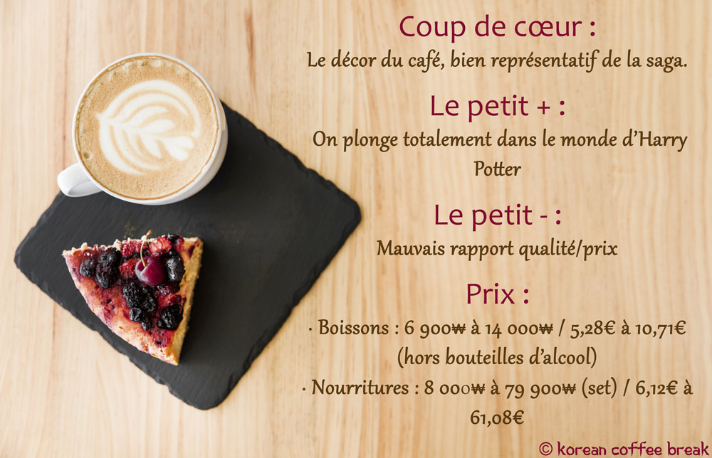 19 novembre 2019 at 11:23Votre article fait baver les filles ! Ah, je m’en veux de ne pas être entrée dans ce café quand j’étais à Séoul ! Surtout que je suis une fan de HP. Merci beaucoup pour la carte, les tarifs et les plans, c’est très utile ! Surtout pour les gens qui, comme moi, ont tendance à se perdre ^^’