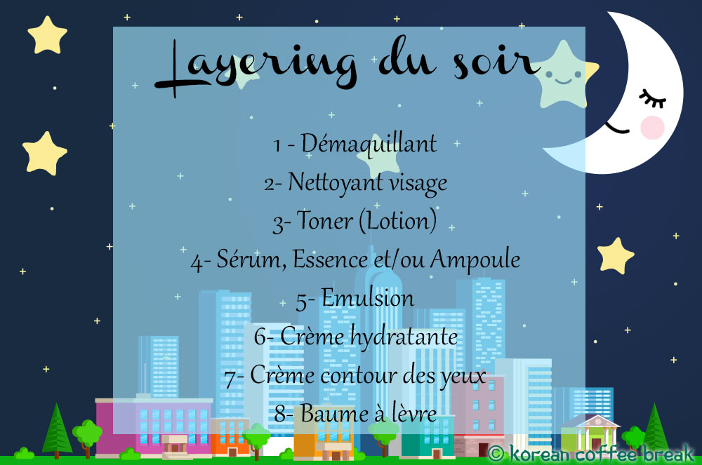 Bien que très semblable à la routine matinale, il est important de rajouter une étape fondamentale au layering : le démaquillant. Je vous invite à découvrir ci-dessous les différentes étapes et ajustements du layering pour votre routine de fin de journée.