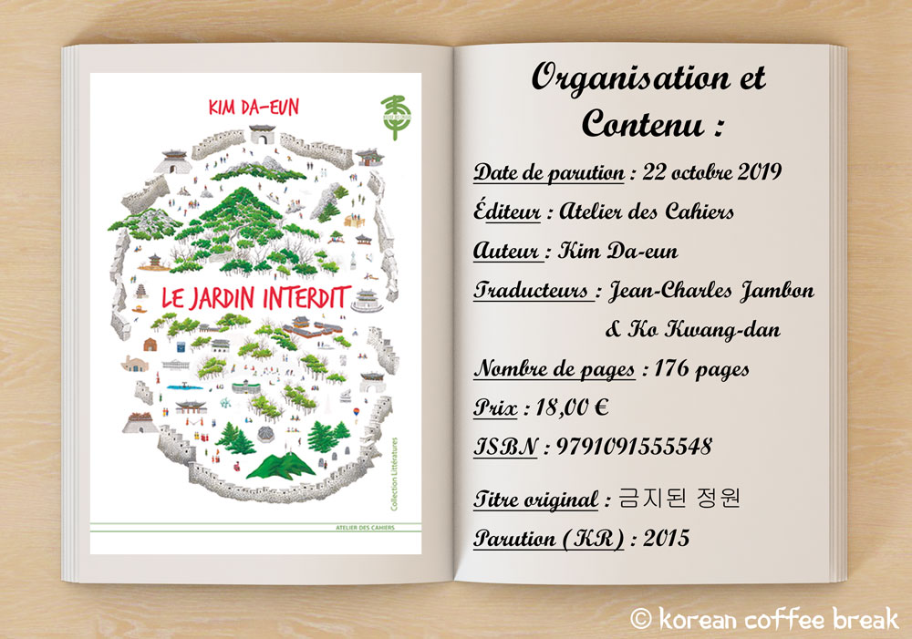 « Le jardin interdit » est un roman d’intrigue durant la colonisation japonaise (1910 – 1945). L’histoire s’articule autour de la géomancie coréenne, l’art de choisir un terrain propice pour y construire un lieu de vie ou bien une sépulture. Paru en 2015 en Corée du Sud, c’est en octobre 2019 que ce roman sera traduit en France par l’intermédiaire de l’Atelier des cahiers.