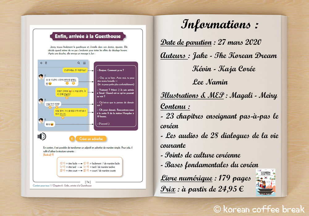 - Coréen pour tous : si vous souhaitez apprendre le coréen pour vous débrouiller lors d’un voyage ou en vue de préparer un PVT, ce livre est parfait afin d’apprendre les bases et bien plus encore pour avoir un bon niveau de coréen dans les situations de vie courante.