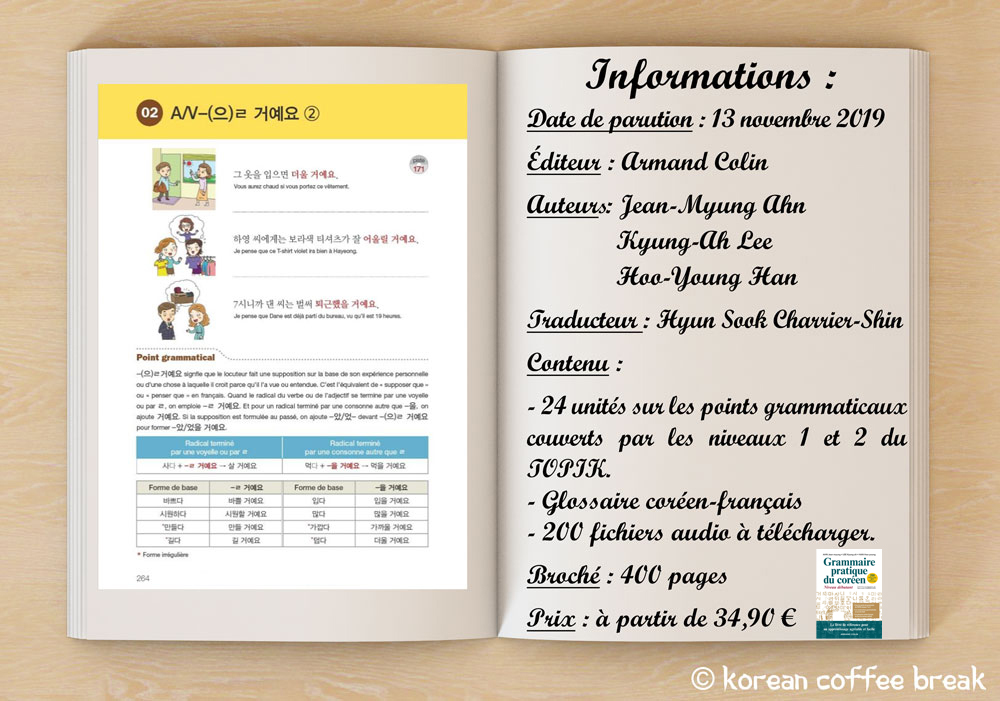 - Cours de coréen : ce livre est un indispensable à acquérir pour apprendre le coréen, car il est vraiment complet malgré quelques bémols.
